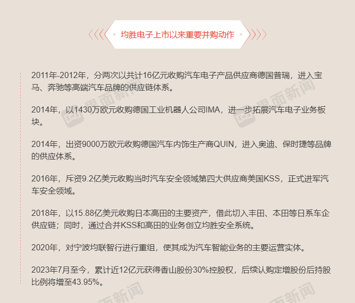 于2011年,均胜电子借壳辽源得亨在A股上市,随后开始激进扩张。2011年至今,公司先后收购了普瑞、德国工业机器人研发公司IMA、德国汽车内饰生产商QUIN、智能车联公司美国TechniSat Automotive、当时汽车安全领域第四大供应商美国KSS、以及日本高田资产(PSAN业务除外)、购买延锋百利得部分资产等。此后,均胜电子又陆续收购宁波均联、A股上市公司香山股份等。